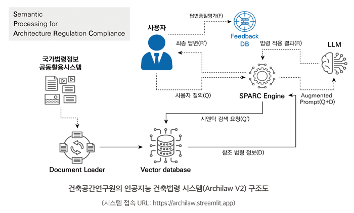 건축공간연구원(auri)은 국내 건축행정의 문제를 해결하기 위해 대규모 언어모델(LLM) 기반의 건축법령 해석 지원 시스템 Archilaw를 개발했다. 2024년 공개된 Archilaw V2는 최신 GPT-4o 모델과 고도화된 RAG(검색 증강 생성) 기술을 적용한 시스템이다(조상규 외, 2024). 주요 성과는 다음과 같다.