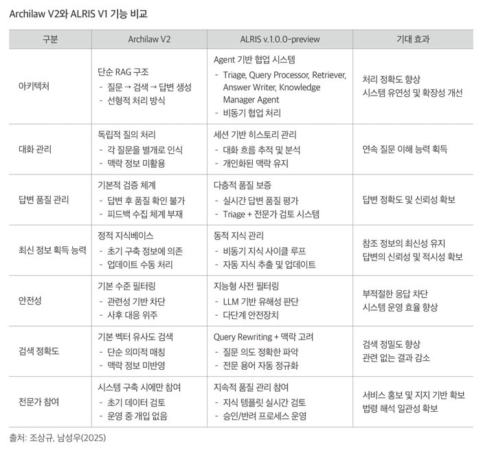 Archilaw V2는 실증적 성과를 거두었으나, 각 질문을 독립적으로 처리하여 대화 맥락을 관리하지 못하는 점, 생성된 답변의 품질을 검증하는 체계가 부족한 점, 그리고 법령 개정을 실시간으로 반영하기 어려운 정적 지식베이스 등의 한계를 가지고 있다(조상규, 남성우, 2025). 이러한 한계를 극복하기 위해 건축공간연구원은 차세대 시스템인 ALRIS(AI Legal and Regulatory Intelligence System) 개발을 진행 중이다. ALRIS는 최신의 에이전틱 AI(Agentic AI) 기술 및 커뮤니티 인텔리전스 개념을 도입한 자기진화형 AI 시스템으로 개발된다(조상규, 남성우, 2025).