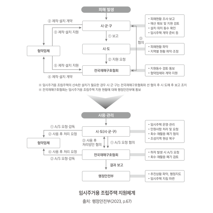 No.304 2025.11.12.된다. 임시조립주택은 「재해구호법」 및 「임시주거용 조립주택 운영지침」에 근거하여 제공되며, 행정안전부와 지방자치단체 등이 시행 주체가 되어 무상으로 지원한다. 임대주택은 「공공주택 특별법」에 따라 국토교통부와 LH 등이 중심이 되어 공급 물량 등 여건에 따라 공공임대 또는 전세임대 형태로 제공된다. 이러한 법령 및 지침에 근거한 임시조립주택의 지원 절차는 다음과 같다.