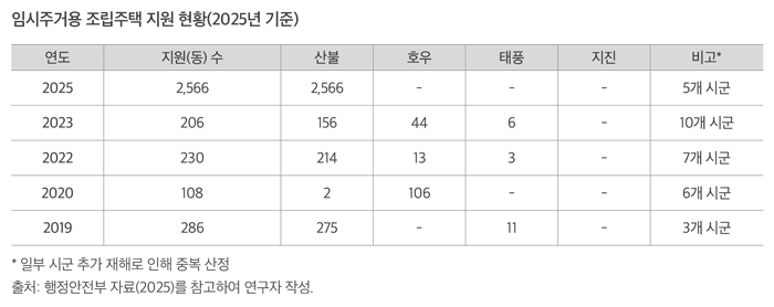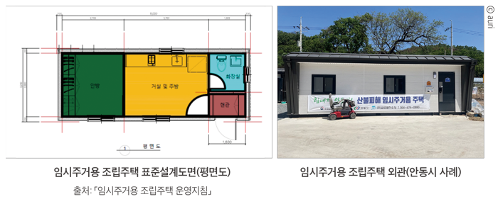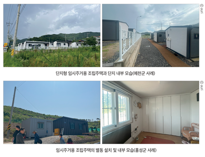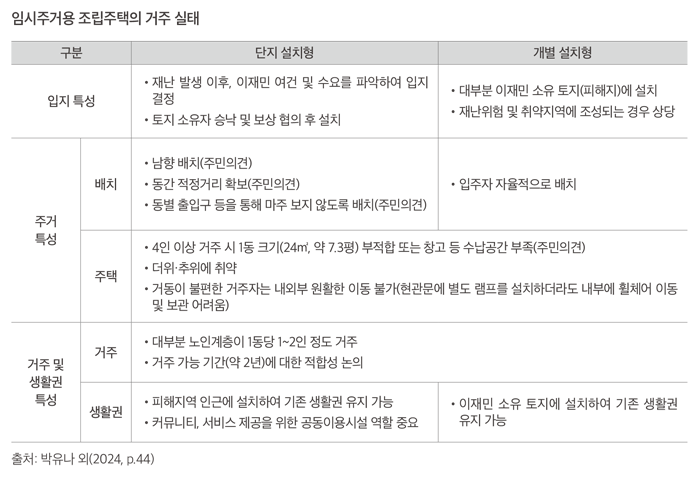 통상 재난이 발생하면 학교, 체육시설, 마을회관, 경로당 등과 같은 임시주거시설로 긴급 대피하여 단기간 일시 거주한 후, 중·장기 거주가 필요한 경우에는 임시조립주택이나 임대주택으로 이주한다. 그러나 이러한 단계별 임시거주시설의 시기나 유형 등에 대해 규정하고 있는 바는 없다. 특히 최근 산불과 호우 등으로 인한 대규모 재해가 발생했는데, 예컨대 올해 안동시 지역에만 950여 동의 임시조립주택이 지원되었다. 이 과정에서 임시조립주택의 단지형 조성이 긴급히 추진되어야 했으나, 개별형 외에 단지 설치와 관련된 부지 조성이나 배치 등에 대해서는 별도의 기준이 없는 상황이었다. 또한 기존 주택의 복구 지연 또는 이주 장기화에 대응할 수 있는 대안 역시 미비한 실정이다.