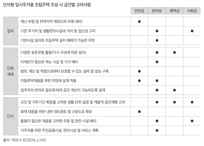 국내외에서 재난의 규모와 양상이 변화함에 따라, 삶의 터전을 잃는 이재민이 지속적으로 증가하고 있다. 특히 광역적 차원의 재난은 기반시설의 붕괴와 지역 내 활용 가능한 시설 또는 주거공간의 부족을 초래할 수 있으며, 대규모 재난이 발생한 튀르키예(2023)와 일본 노토반도(2024)에서는 이미 이러한 상황이 나타났다. 향후 대규모 재난 발생을 염두에 둘 때, 구호 단계를 넘어 복구 단계까지 포괄할 수 있는 방안으로서 단지형 임시주거용 조립주택 지원체계에 대한 선제적 대비가 시급하다. 무엇보다 이재민의 생활 안정과 일상 회복을 유도하기 위해서는 거주성을 확보하는 것이 중요한데, 거주성을 구성하는 네 가지 핵심 지향점인 안전성·편의성·적응성·사회성에 대한 고려를 바탕으로 다음의 조성 기준을 제안한다.