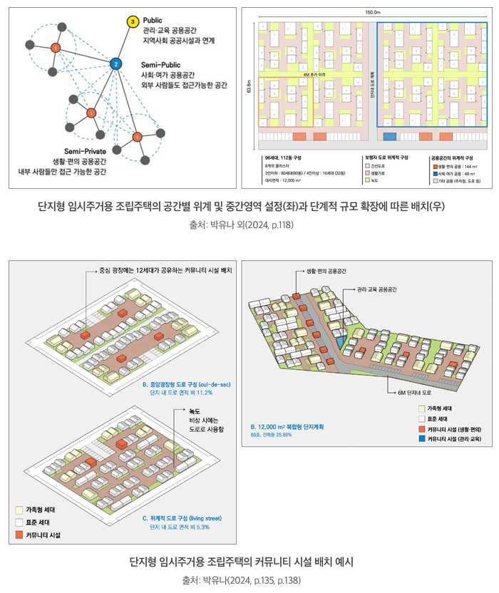 임시조립주택을 단지 형태로 조성할 경우, 개별형에서 고려하는 주거 기능 외에도 입지 특성, 단지 내 동선, 주민공동시설 등에 대한 계획 기준이 필요하다. 입지의 경우 안전성과 편의성을 중점적으로 고려해야 하는데, 무엇보다 재난으로 인한 2차 피해를 최소화할 수 있는 지역이어야 한다. 또한 주민의 생활 편의를 고려하여 접근성이 양호하고, 대규모 임시조립주택의 설치· 해체가 용이한 부지를 선정해야 한다. 개별 주택은 거주 기간 동안 불편함을 최소화할 수 있는 성능을 갖추는 동시에, 장기 거주 상황에도 유연하게 대응할 수 있도록 설계되어야 한다. 단지 차원에서는 규모와 거주 기간 등을 고려하여 점진적인 공간계획을 수립해야 한다. 이를테면 단지 규모에 따라 가로공간의 위계를 설정하고 차량 및 보행자 동선을 분리하며 거주민 특성을 반영한 주거지원시설과 주민공동시설 등을 계획하는 것이다. 공동이용시설은 개별 세대의 부족한 기능을 보완함과 동시에, 입주자들이 함께 모여 논의하거나 사회활동을 할 수 있는 집회시설의 역할을 수행할 수 있다. 또한 돌봄이 필요한 계층을 위한 지원 공간으로 활용될 수도 있다. 이러한 시설은 단지 내 어느 위치에서도 접근이 용이하도록 배치하는 것이 중요하다.