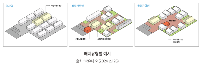 첫째, ‘격자형’은 신속한 지원이 요구되거나 소규모 단지, 익명성을 선호하는 계층이 다수 거주할 경우 적용할 수 있다. 일관된 배치를 통해 단지를 신속하게 조성할 수 있으며, 차량 및 물자 이동의 효율성이 높다는 장점이 있다. 둘째, ‘생활가로형’은 세대 전용 외부공간이나 녹지를 조성하여 단지 외부 공간을 적극적으로 활용할 수 있는 유형이다. 주거동 앞에 형성된 공적 공간을 중심으로 주민 간 자연스러운 교류와 만남이 이루어질 수 있다는 특징이 있다. 셋째, ‘돌봄강화형’은 돌봄서비스와 연계를 강화하여, 돌봄이 필요한 세대나 어린이 등 재난 약자를 배려한 배치 계획이다. 단지 중앙에 위치한 공용공간을 중심으로 돌봄서비스를 제공할 수 있다. 다만, 격자형과 달리 익명성 보장에는 한계가 있으므로 이재민들의 여건을 종합적으로 고려해 선택하는 것이 바람직하다.