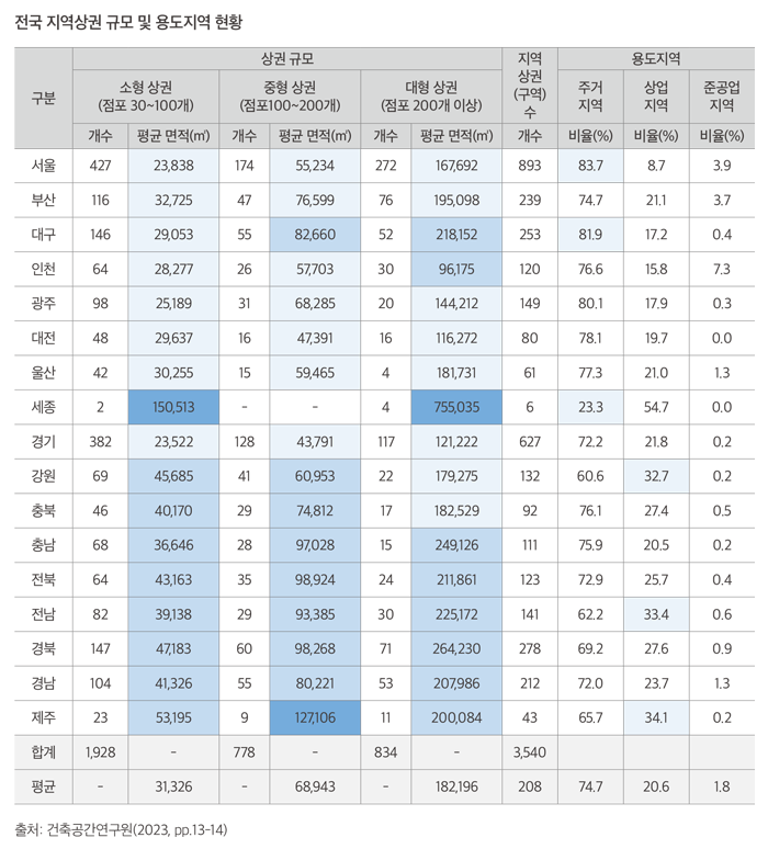 • 소형 상권이 54.5%, 용도지역상 주거지역에 입지하는 지역상권이 전체 74.7%를 차지 전국 지역상권의 규모는 소형 상권이 1,928곳(54.5%), 중형 상권이 778곳(30%), 대형 상권이 834곳 (23.6%)으로 나타났다. 지역별로 소형 상권은 특·광역시 및 경기도가 2만~3만㎡, 그 외 지역은 4만㎡ 대이며, 중형 상권은 특·광역시 및 경기도가 5만~7만㎡, 그 외 광역도가 6만~9만㎡, 대형 상권은 대체로 10만~20만㎡대로 나타났다. 이는 대도시의 경우 작은 면적 내 많은 점포가 밀집하여 상권을 형성하는 반면, 지방 중소도시는 넓은 면적에 점포가 낮은 밀도로 분산되어 형성하는 것을 의미한다.