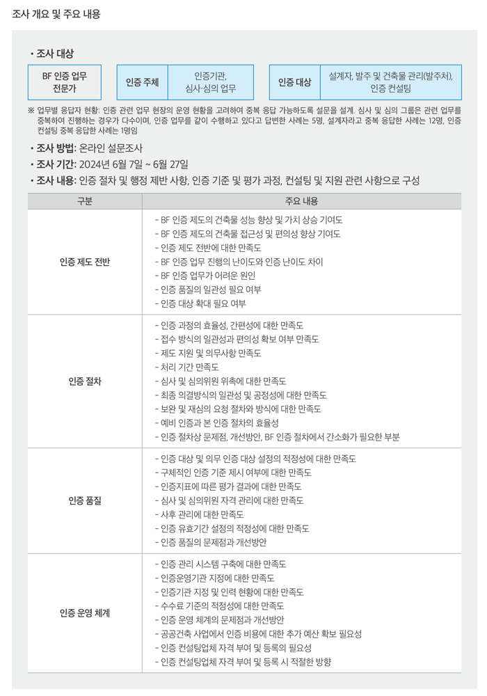 조사에서는 사전에 FGI를 통해 BF 인증과 관련된 핵심 문제를 파악하고, 이를 통해 도출된 이슈를 질문으로 전환하는 과정을 수행하였다. BF 인증은 예비와 본 인증으로 구분하여 이루어지고 있으며 설계자나 발주처, 인증 컨설팅 기관에서 인증을 접수하면 인증기관에서 전문가로 구성된 심사와 심의 위원회를 구성하여 인증 여부 및 등급을 결정하는 과정을 거치고 있다. 이에 현장에 대한 심층적인 이해를 위하여 인증 주체와 인증 대상으로 구분하여 업무 특성에 따라 5개 그룹으로 구성하여 그룹별로 3~5인의 전문가들을 대상으로 심층 면담을 수행하였다. 면담 결과를 바탕으로 BF 인증 제도의 절차, 품질, 운영 체계 측면의 현안 파악과 개선 방안에 대한 의견 수렴을 위한 설문 조사 문항을 기획하였다.