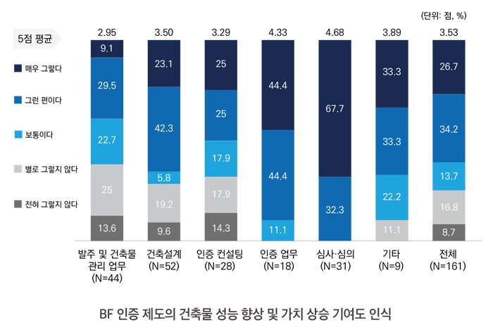 전체 응답자의 60.9%는 BF 인증 제도가 건축물 성능 향상 및 가치 상승에 기여한다고 응답하였다. 심사·심의 업무 담당자들은 67.7%가 ‘매우 그렇다’고 응답해 매우 긍정적인 평가를 보였으며, 인증 업무 담당자들도 44.4%가 ‘매우 그렇다’, 44.4%가 ‘그런 편이다’라고 답해 긍정적인 평가가 주를 이루고 있다.