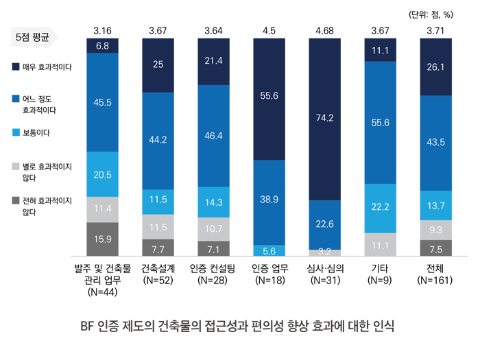 전체 응답자의 69.6%는 BF 인증 제도가 건축물의 접근성과 편의성 향상에 기여하였다고 평가하였다. 심사·심의 업무와 인증 업무 종사자들은 각각 74.2%와 55.6%가 ‘매우 효과적이다’ 라고 응답해 긍정적인 평가를 보였다. 반면에 건축설계와 인증 컨설팅 종사자들은 ‘매우 효과적이다’라는 응답이 각각 25.0%와 21.4%로 다소 신중한 반응을 보였다. 발주 및 건축물 관리 업무 종사자들은 6.8%만이 ‘매우 효과적이다’라고 답했고, 15.9%는 ‘전혀 효과적이지 않다’고 응답해 부정적인 인식이 상대적으로 높았다.
