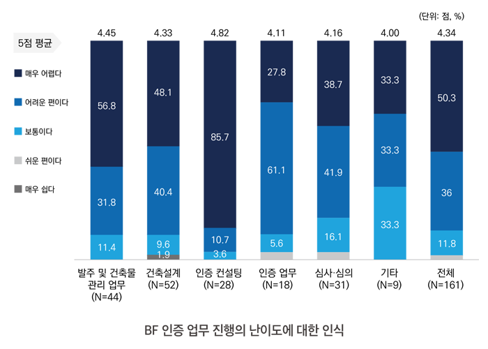 응답자의 86.3%는 BF 인증 업무를 매우 어려운 업무라고 인식하고 있는 것으로 나타났다. 특히 인증 컨설팅 분야에서는 85.7%가 ‘매우 어렵다’고 응답하였으며, 발주 및 건축물 관리 업무와 건축설계 분야에서도 각각 56.8%와 48.1%가 ‘매우 어렵다’고 응답하였다. 흥미로운 부분은 인증 업무를 주 업무로 수행하고 있는 인증기관 담당자들 또한 27.8%가 ‘매우 어렵다’, 61.1%가 ‘어려운 편이다’라고 답변하였다는 점이다.