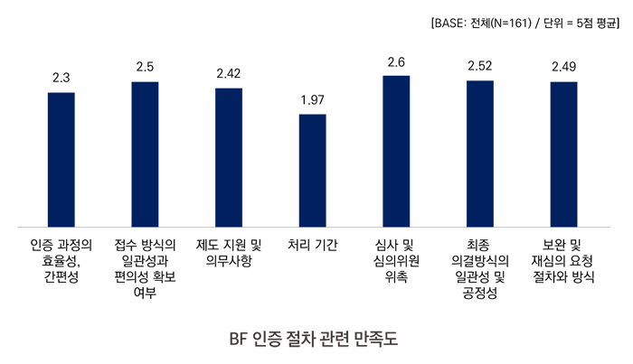BF 인증 절차 관련 만족도는 보통 수준이다. 모든 그룹의 응답자들은 ‘처리 기간’에 대해서 1.97 이라는 가장 낮은 점수를 부여하였다. 특히 인증 컨설팅 분야 응답자들은 모든 항목에서 문제가 있다고 답변하였다.