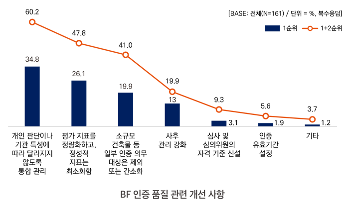 BF 인증 제도 개선을 위하여 가장 개선이 필요한 분야에 대한 질문에 전체 응답자의 35.7%는 인증 절차, 35.6%는 인증 운영 체계 개선을 꼽았다. 인증운영기관의 부재는 BF 인증 제도의 발전을 위해 반드시 해결해야 할 과제 가운데 하나였으나, 2025년 1월 한국장애인개발원이 인증운영기관으로 지정되어 본격적인 업무를 시작함에 따라 실질적인 인증 제도 개선을 추진할 수 있는 기반이 마련되었다.