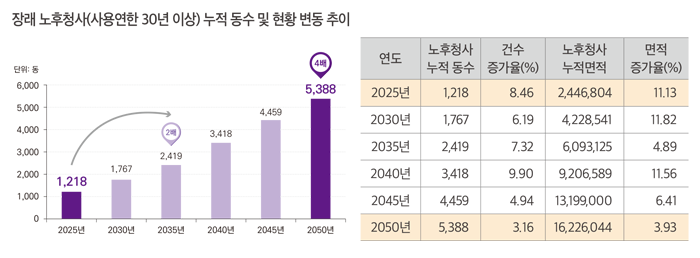 특히 1990년대에 집중적으로 건립된 대규모 청사들이 2020년대 중반부터 본격적으로 노후화 기준을 초과함에 따라, 노후화의 속도는 향후 10년 내에 가파르게 상승하여 2035년에는 2배에 달하는 2,419동, 25년 뒤인 2050년에는 5,388동으로 4배 이상 급증할 것으로 예측된다. 노후화되는 청사건물의 규모 역시 급격히 커져 관리 부담이 가중될 것으로 전망되는데, 2025년 약 245만㎡이었던 연면적은 20250년 약 1,623만㎡로 6.6배 이상 증가할 것으로 보여 청사 노후화에 따라 더 복잡한 설비, 더 많은 안전점검 항목, 더 큰 보수 비용이 수반되어 국가 재정에 영향을 끼칠 것으로 전망된다.