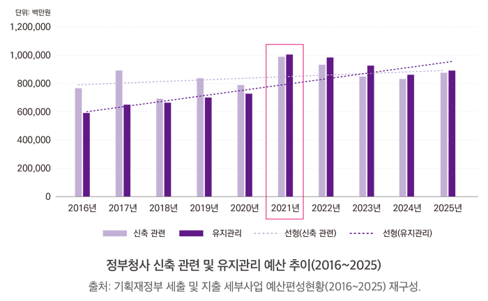 기획재정부 세출 및 지출 세부사업 예산편성현황(2016~2025)을 분석한 결과, 2021년을 기점으로 청사 ‘유지관리’ 관련 예산이 ‘신축 관련’ 예산을 초과(2025년 신축 예산은 8,759억 원, 유지관리 예산은 8,886억 원)하였으며, 이러한 경향은 이후에도 지속되고 있어 국가 자산 지출이 신규 공급에서 유지관리 체제로 이동하고 있음을 알 수 있다.