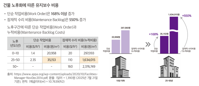 건물이 노후화될수록 유지보수 비용은 가파르게 상승한다. 국제표준 ISO 4101에 따른 유지보수 비용을 살펴보면, 10년 미만 시설 대비 25~50년 경과 시설은 단순 작업비용(Work Order)이 약 168% 증가하며, 제때 수리하지 못해 쌓이는 잠재적 수리비용(Maintenance Backlog)은 무려 550%나 급증할 것으로 예측된다.
