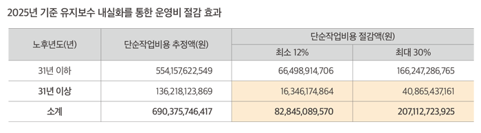 이러한 유지보수 비용 절감 효과를 전체 청사에 적용할 경우 최소 12% 적용 시 최소 828억 원, 최대 30% 적용 시에는 2,071억 원이 절감될 것으로 예상된다.
