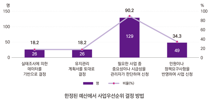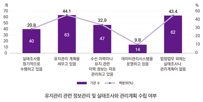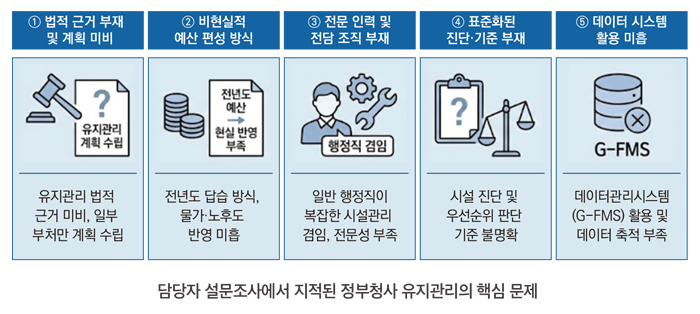 정부청사 수급관리 대상이 되는 청사관리본부 소관 청사와 부·청의 유지관리 담당자 총 521 명의 대상자 중 143명이 응답한 설문조사(2025.4.10.~5.20.)를 분석한 결과 핵심 문제로 ①「정부청사관리규정」의 신축 및 증축에 대해 청사수급관리계획을 매년 수립하나, 유지관리에 대한 법적 근거 부재로 시설 진단 및 계획을 수립하는 부처가 한정적인 문제 ②유지관리 예산 편성이 실제 건물의 상태나 시급성보다는 전년도 답습 방식으로 이루어져, 물가 상승이나 노후 설비의 복잡성을 반영되지 못하는 문제 ③일반 행정직이 건축·전기·소방 등 복잡한 시설관리 업무를 겸임하는 등 전문 인력이 부재한 문제 ④시설 진단 및 유지관리 우선순위를 결정하는 표준화된 기준 없이 담당자 주관적 판단에 의존하는 문제 ⑤시설 유지관리에 대한 데이터관리시스템 (G-FMS)의 활용도 저하에 따른 데이터 축적 및 활용 미흡 문제 등이 도출되었다.