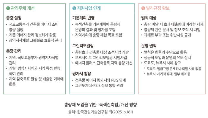 이런 점에서 볼 때, 「녹색건축법」은 건축물 에너지 소비 총량제의 도입과 운영을 위한 근거법으로 타당하다. 하지만 총량제를 시행한다고 했을 때, 현행 규정만으로는 부족하며 총량제 주체·대상· 지원·벌칙 등 세부사항에 대한 개선이 필요하다.