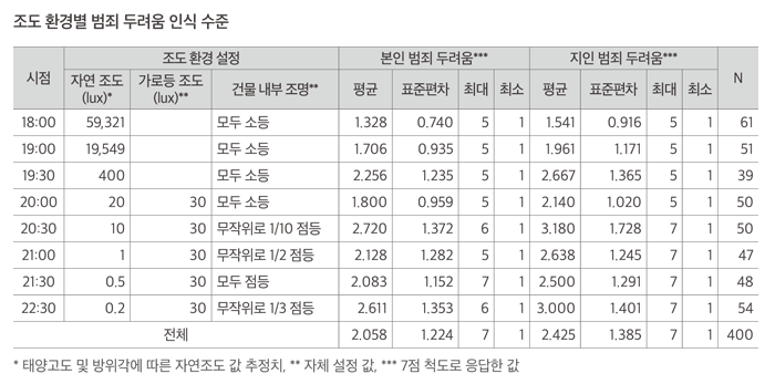 CPTED는 범죄 예방과 함께 범죄 두려움 완화를 주요 목적으로 한다(유광흠 외, 2015, p.18). 범죄 두려움은 어두운 공간에서 더 크게 나타나며, 실제 조명환경 및 조도 개선 이후 범죄 두려움이 낮아지는 효과가 있었다(Boyce et al., 2000, p.87; Fotios et al., 2019, pp.571-572). 이에 많은 선행 연구에서 조도 변화에 따른 범죄에 대한 불안감을 분석하였으며 안정감을 느끼는 조도의 수치를 제시하였지만, 다양한 환경적인 요인들을 통제하였다고는 볼 수 없다(Boyce et al., 2000, pp.87-88; 손동필 외, 2021, pp.126-127).
