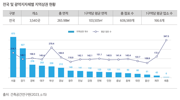 지역상권의 기능 변화는 전국 지역상권의 현황과 활성화 정도 분석에서도 확인할 수 있다. 2023년 종합계획에서는 가로별 업소밀집도를 적용하여 지역상권 구역계 잠정치를 도출하였다. 이를 통해 도출된 내용은 다음과 같다.
