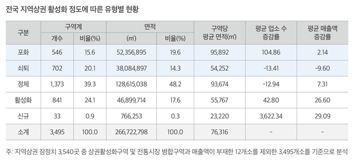 전국 지역상권의 활성화 정도를 지난 5년간(2019~2023년) 업소 수 증감률과 2022년 대비 2023년 매출액 증감률을 기준으로 분석한 결과, ‘정체(39.3%)’, ‘활성화(24.1%)’, ‘쇠퇴(20.1%)’, ‘포화 (15.6%)’, ‘신규(0.9%)’ 상권 순으로 나타났다. 특히 매출 대비 업소 수가 과다한 포화 상권과 폐업이 증가하고 매출이 감소하는 쇠퇴 상권이 전체의 35.7%를 차지하여 정책적 관리가 필요하다. 대부분의 지역상권은 고도 경제성장기에 형성되어 현재의 인구 규모에 비해 상권 규모가 크고, 인구 감소에 따른 소비수요 감소로 폐업과 빈 점포가 증가하고 있다. 이는 지역의 소비 수요와 특성을 고려하여 맞춤형 공간관리 전략이 필요함을 시사한다.