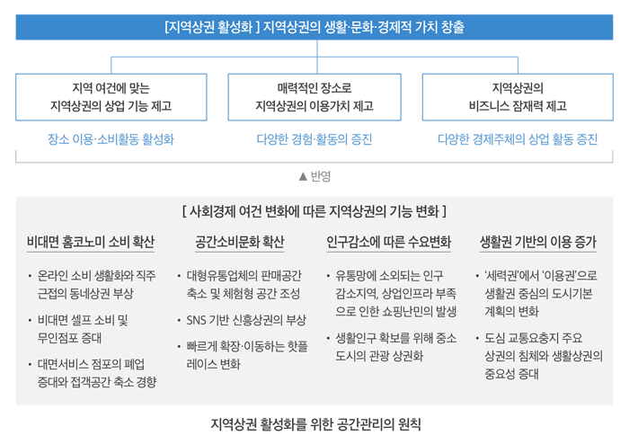 지역상권 활성화는 단순히 유동인구 증가, 상인의 매출 증대, 지역의 세수 증가 등의 경제적 가치에 한정하지 않고, 지역상권의 생활·문화·경제적 장소로서 가치를 창출하는 데 있다. 이를 위해 지역 여건에 맞는 상업 기능 강화, 지역상권의 장소가치 제고, 지역상권의 비즈니스 잠재력 제고의 세 가지 공간관리가 필요하다.