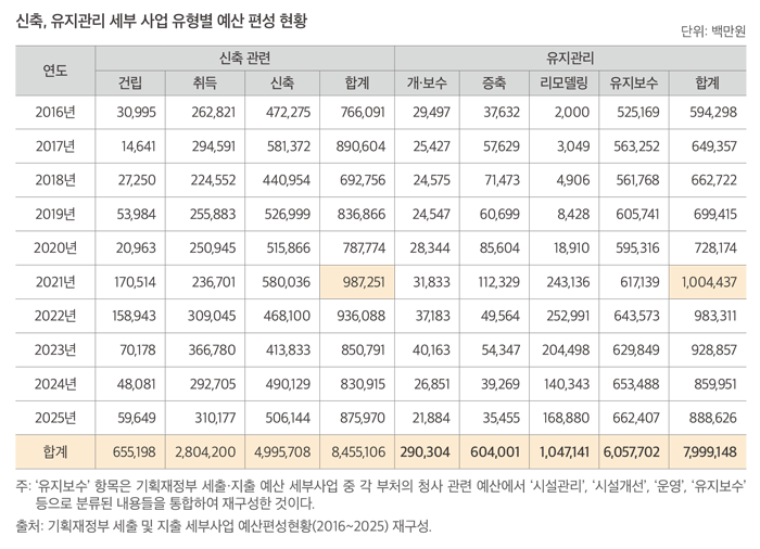 기획재정부 세출 및 지출 세부사업 예산편성현황(2016~2025)을 분석한 결과, 2021년을 기점으로 청사 ‘유지관리’ 관련 예산이 ‘신축 관련’ 예산을 초과(2025년 신축 예산은 8,759억 원, 유지관리 예산은 8,886억 원)하였으며, 이러한 경향은 이후에도 지속되고 있어 국가 자산 지출이 신규 공급에서 유지관리 체제로 이동하고 있음을 알 수 있다.