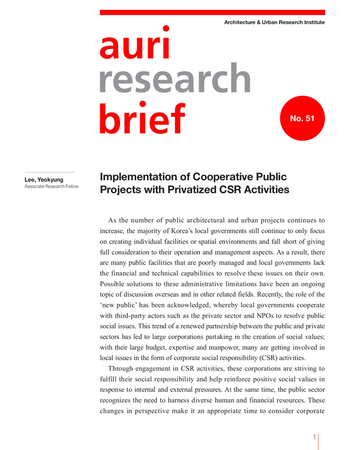 Through engagement in CSR activities, these corporations are striving to fulfill their social responsibility and help reinforce positive social values in response to internal and external pressures. At the same time, the public sector recognizes the need to harness diverse human and financial resources. These changes in perspective make it an appropriate time to consider corporate participation in public architectural and urban projects. This study aims to propose a system that connects privatized CSR activities with public architectural and urban projects in order to overcome limitations in budget, manpower, and expertise. In light of this, the objectives here are to ① analyze the policy and institutional conditions of connecting public architectural and urban projects with CSR activities, ② understand the demand for CSR activities in public architectural and urban projects, and ③ propose ways to draw connections between corporations and public projects.