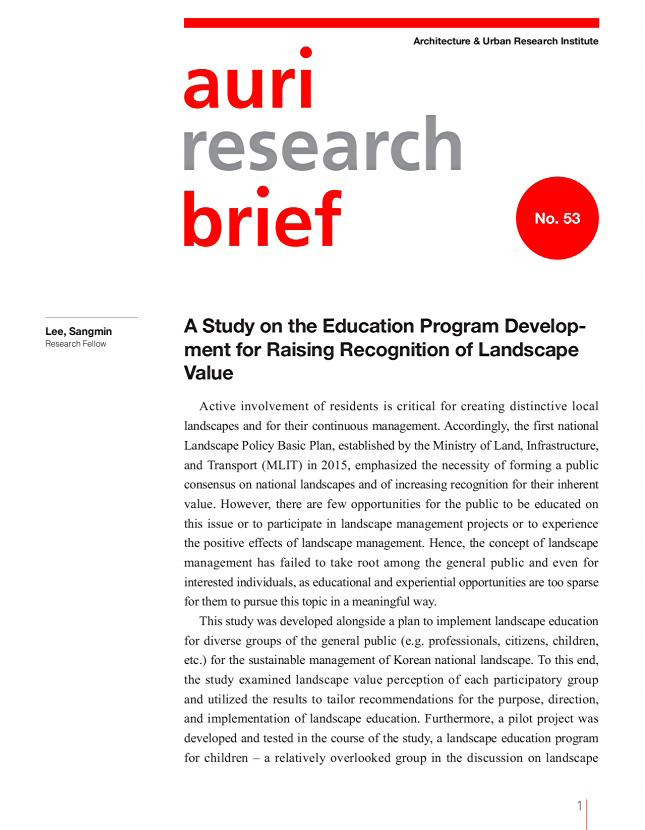 This study was developed alongside a plan to implement landscape education for diverse groups of the general public (e.g. professionals, citizens, children, etc.) for the sustainable management of Korean national landscape. To this end, the study examined landscape value perception of each participatory group and utilized the results to tailor recommendations for the purpose, direction, and implementation of landscape education. Furthermore, a pilot project was developed and tested in the course of the study, a landscape education program for children – a relatively overlooked group in the discussion on landscape education. To develop and verify the applicability of the pilot project, researchers collaborated with Suwon Research Institute under a research agreement.