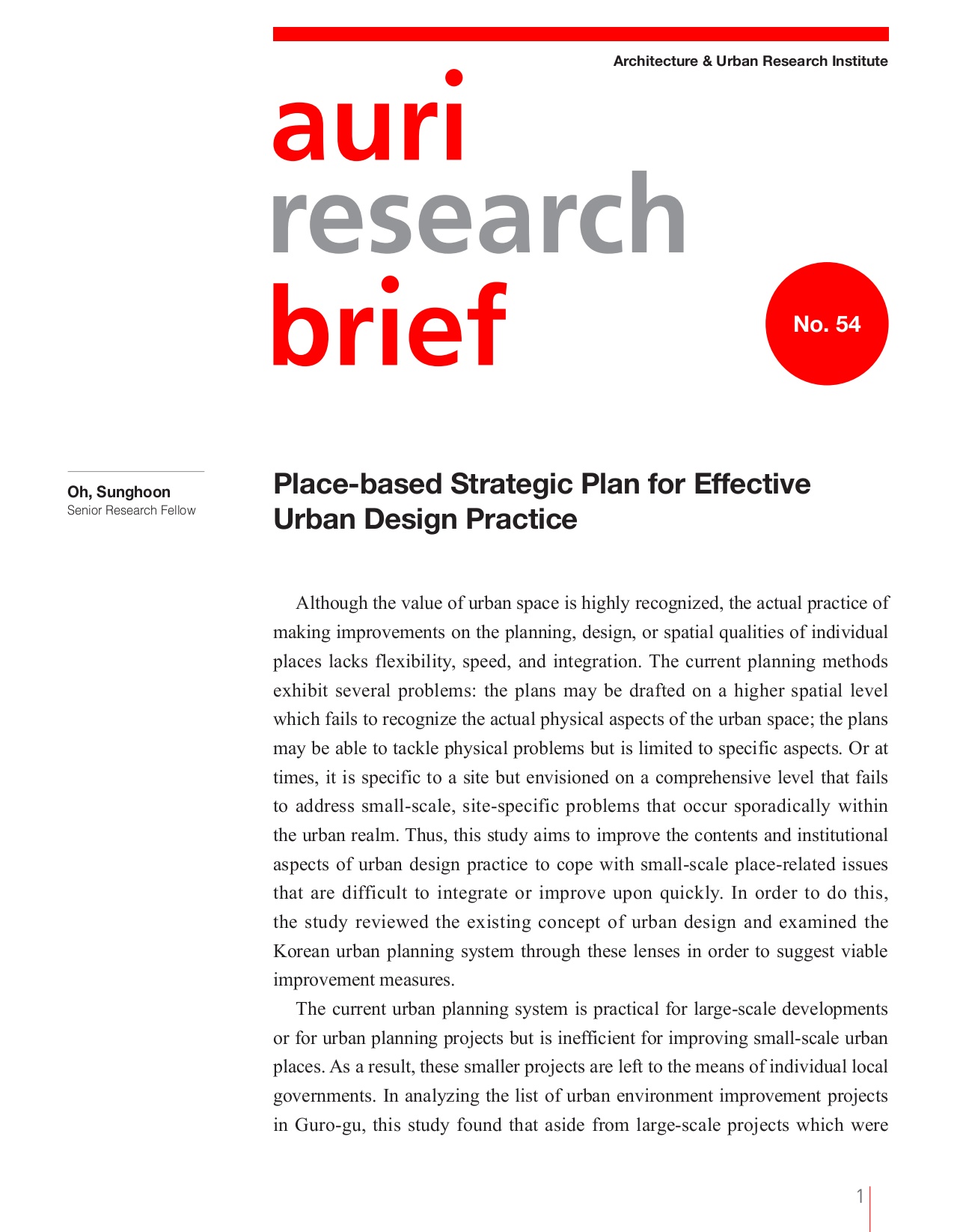 Although the value of urban space is highly recognized, the actual practice of making improvements on the planning, design, or spatial qualities of individual places lacks flexibility, speed, and integration. The current planning methods exhibit several problems: the plans may be drafted on a higher spatial level which fails to recognize the actual physical aspects of the urban space; the plans may be able to tackle physical problems but is limited to specific aspects. Or at times, it is specific to a site but envisioned on a comprehensive level that fails to address small-scale, site-specific problems that occur sporadically within the urban realm. Thus, this study aims to improve the contents and institutional aspects of urban design practice to cope with small-scale place-related issues that are difficult to integrate or improve upon quickly. In order to do this, the study reviewed the existing concept of urban design and examined the Korean urban planning system through these lenses in order to suggest viable improvement measures.